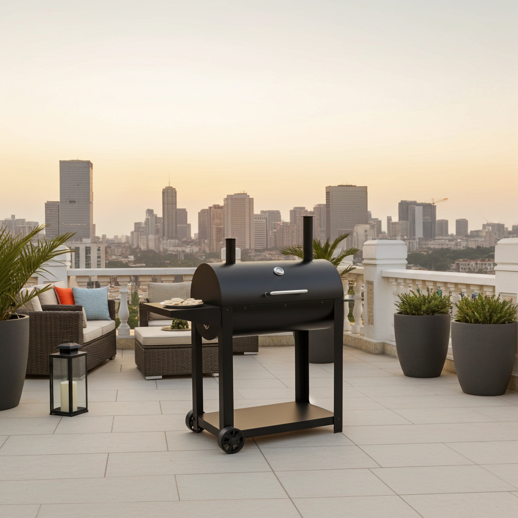 The practicality of this model is at the heart of its design: the height-adjustable charcoal tray can be removed easily, making cleaning simple. A foldable side shelf and a lower shelf for accessories increase your workspace and storage capacity. For effortless handling, it is equipped with two sturdy wheels and a solid handle, ensuring easy movement.