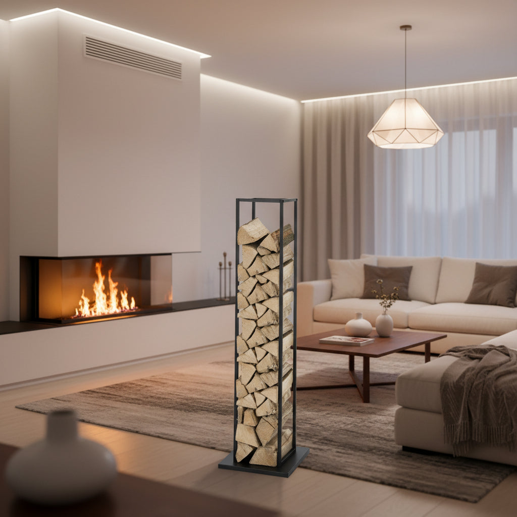Unlike a simple pile of logs on the floor, this log holder offers a clean, aesthetic and well-organised solution. Its vertical structure allows compact wood storage while enhancing the fireplace area. It is equipped with stable feet and is delivered unassembled.