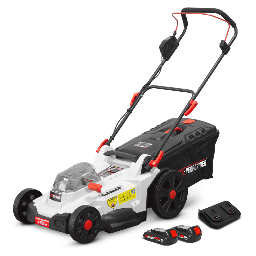 Cordless Lawn Mower 20V Max – 43 cm – Mulching – with 2x 2Ah Batteries & Charger – X-Performer