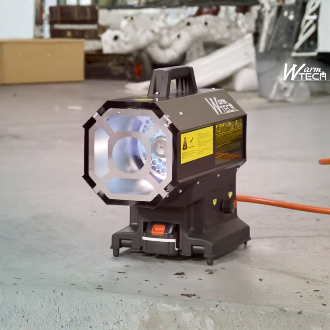 Gasverwarmingskanon instelbaar van 9 tot 20kw en werkend op batterij of netstroom - WARMTECH