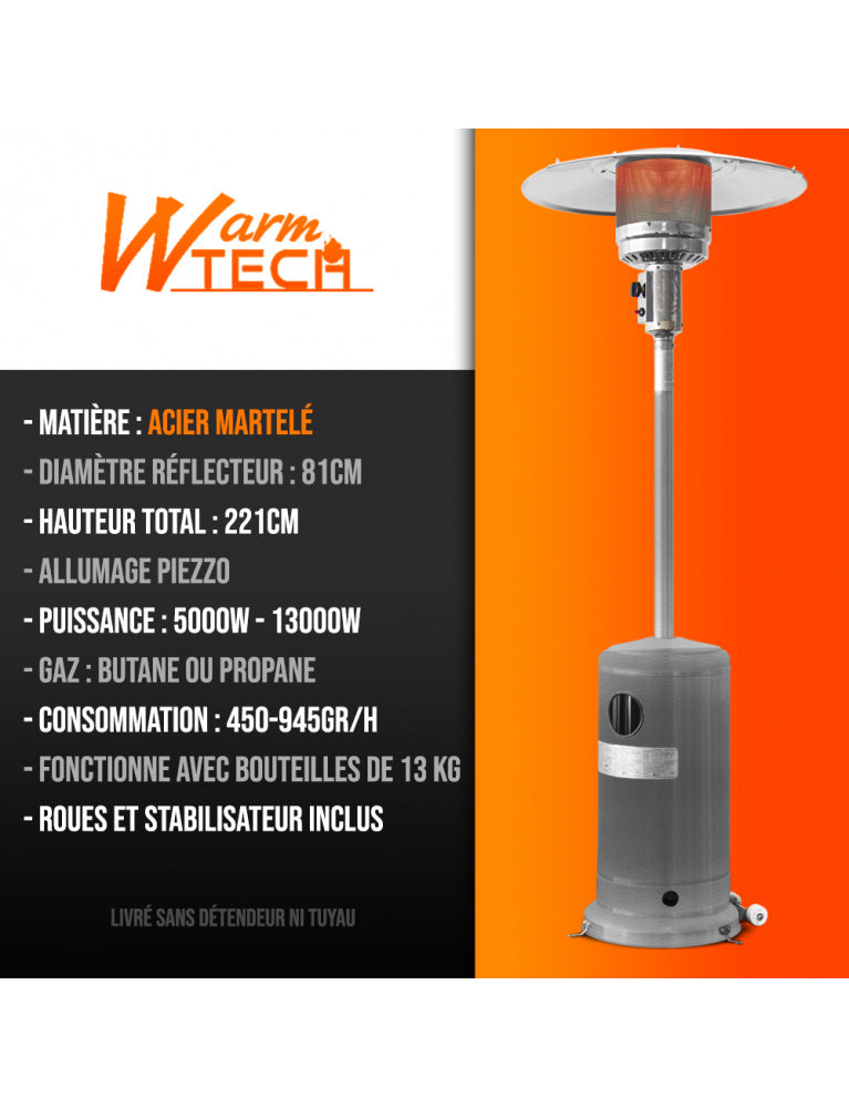 Ce parasol chauffant au gaz de la marque Warmtech vous permettra de prolonger vos soirées en terrasse ou dans le jardin, même lorsque les soirées sont plus fraîches.