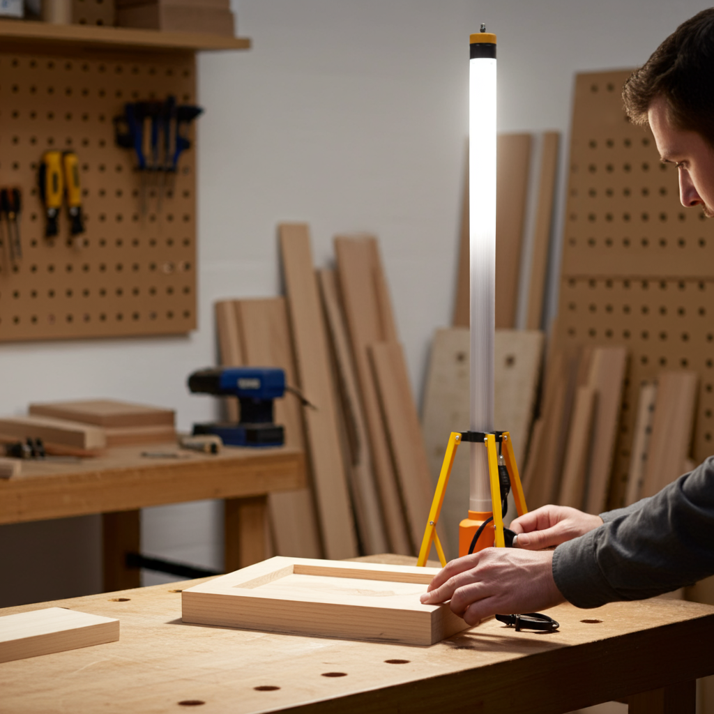 Monté sur un trépied stable d’une hauteur de 157 cm, il assure une diffusion homogène de la lumière tout autour de la zone de travail. Son indice de protection IP54 lui permet de résister aux projections d’eau et à la poussière, pour une utilisation en intérieur comme en extérieur.