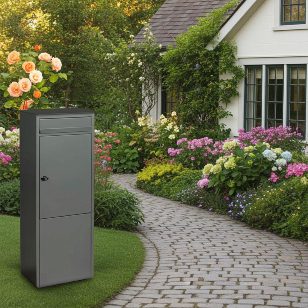 Boîte aux lettres colonne FRANKURT – acier gris mat – grande ouverture A4 – fixation au sol – serrure à clé