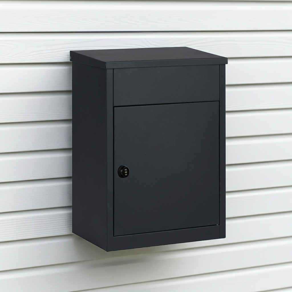 Boîte aux lettres pour paquets noire – acier laminé – grande ouverture – serrure à clé – fixation murale