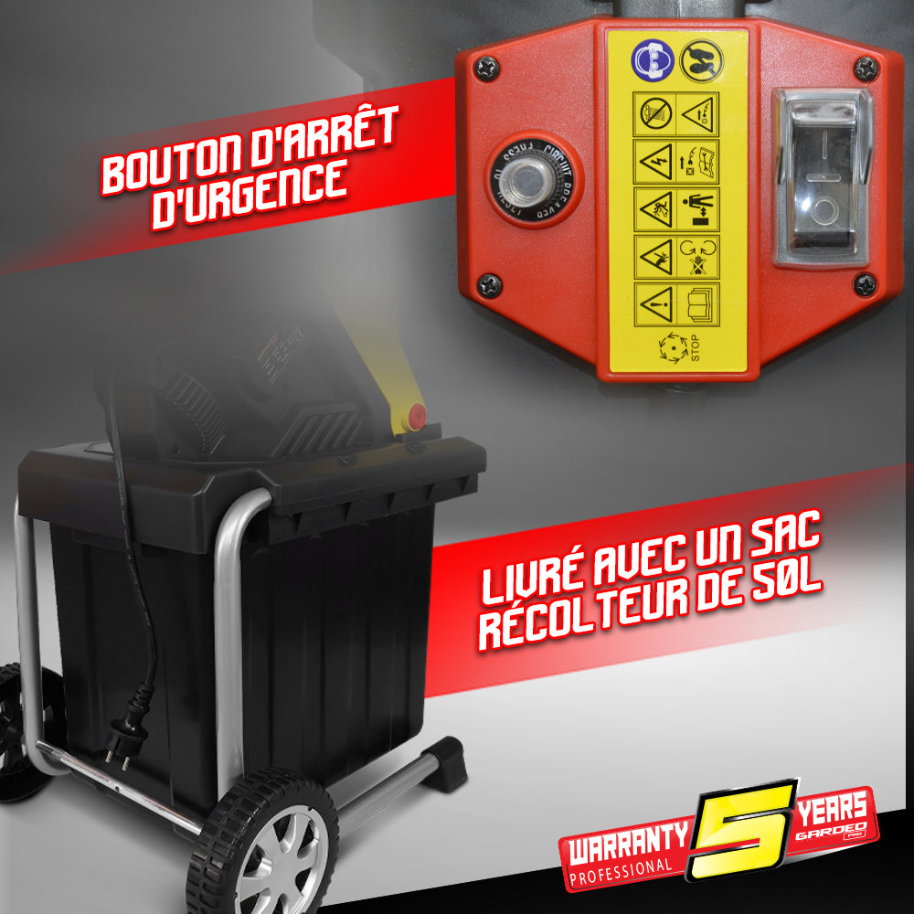 Pour assurer votre sécurité, ce modèle intègre un bouton d'arrêt d'urgence. Il est également pratique avec son bac de ramassage de 50 litres, facilitant le ramassage des déchets.
