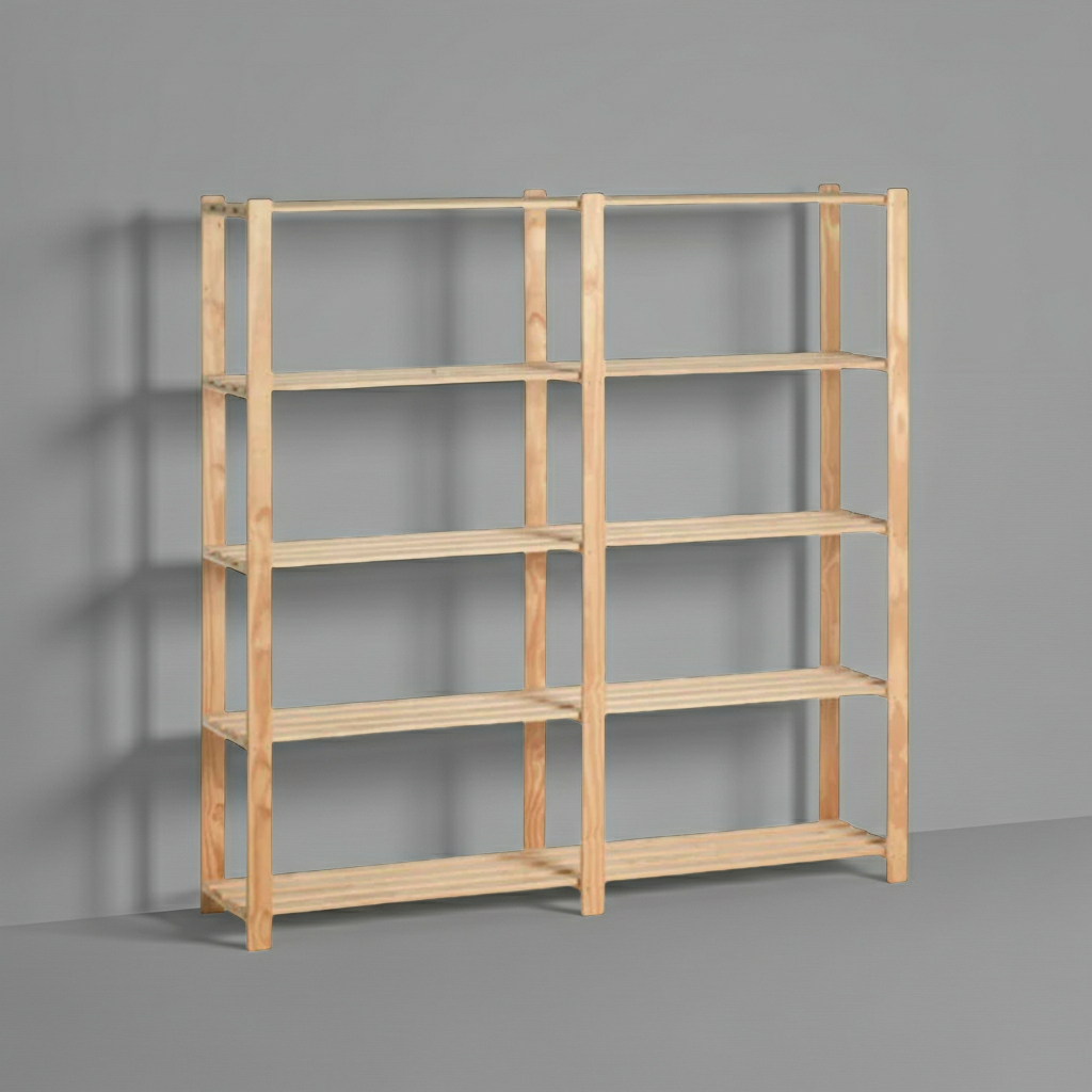 Optimisez votre rangement avec cette étagère double en bois certifié FSC®. Ses 5 tablettes composées de 3 lattes chacune (épaisseur 14 mm) offrent une surface large, stable et respirante pour entreposer linge, chaussures, décorations, boîtes, outils... Chaque étagère peut supporter une charge de 50 kg, pour une charge maximale de 250 kg. Robuste et polyvalente, elle s’intègre facilement dans une chambre d'étudiant, un garage, une cave, un cellier ou une buanderie.