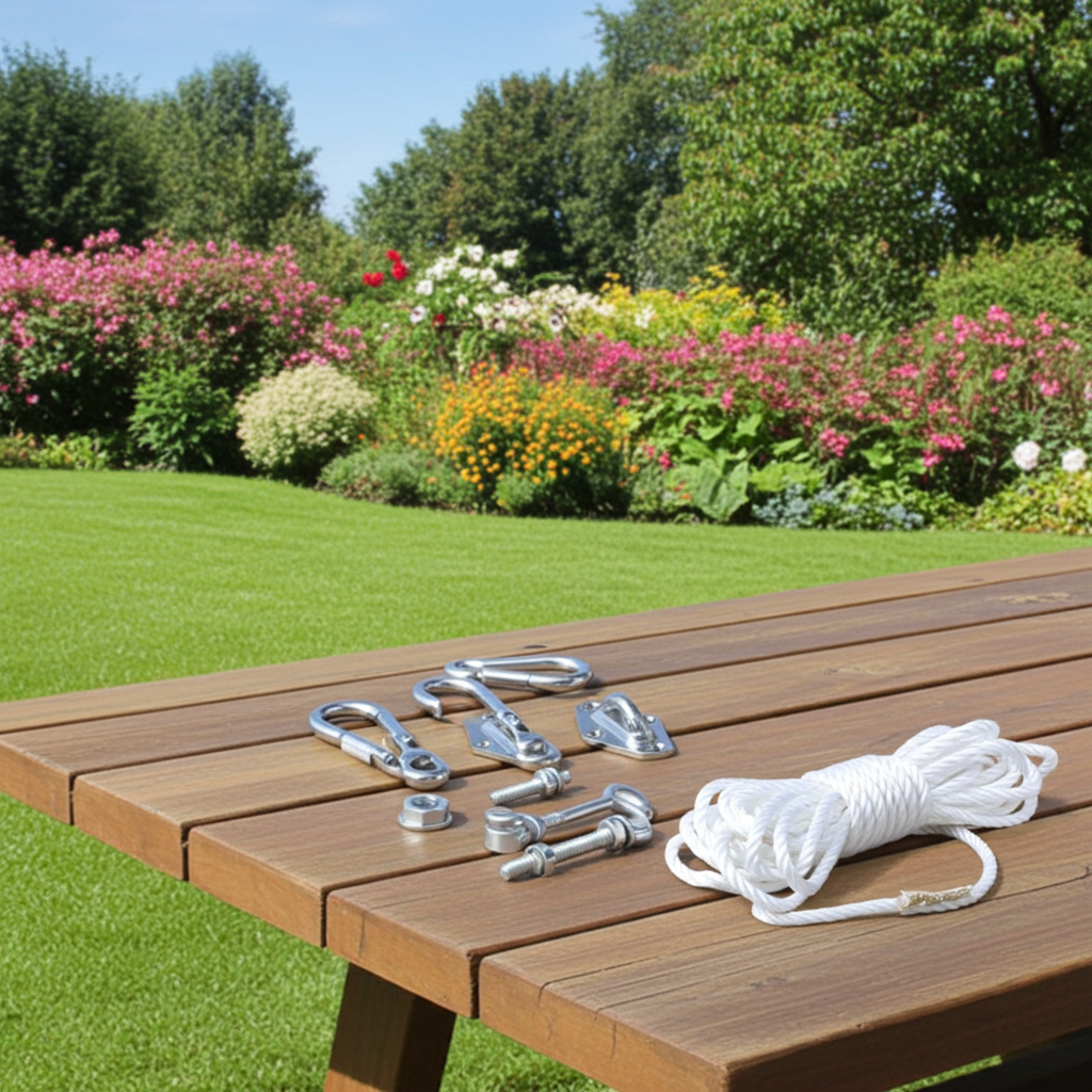 Le kit contient : 2 boucles tournantes, 2 crochets carabines, 2 pontets en acier, 2 boulons ainsi qu’une corde en nylon de 5 mètres. Conçu pour un usage extérieur, il garantit une excellente tenue de votre toile, même en cas de vent.