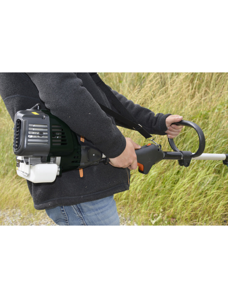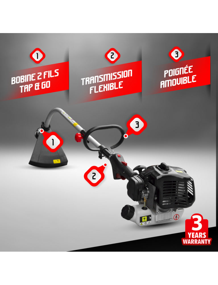 Profitez d'un beau jardin toute l'année grâce à ce coupe-bordure thermique. Équipé d'un moteur 25 CC, il dispose d'une surface de travail d'une largeur de 380 mm et d'un système de coupe « Tap & Go » (en cours d'utilisation, appuyer sur la tête de l'appareil en la cognant au sol afin de faire sortir le fil).