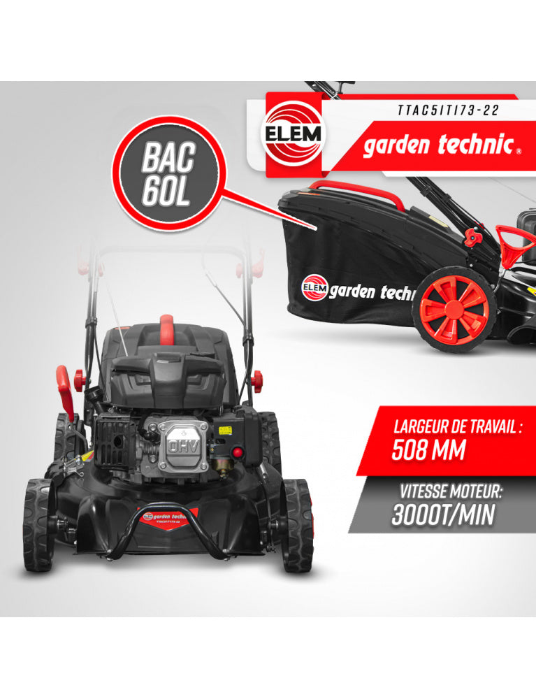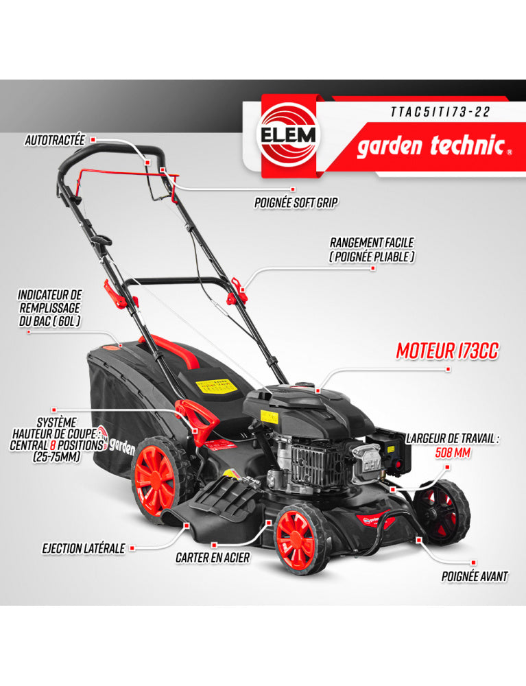 Tondeuse thermique autotractée 173 cc- 508 mm - 8 positions - avec éjection latérale et mulching