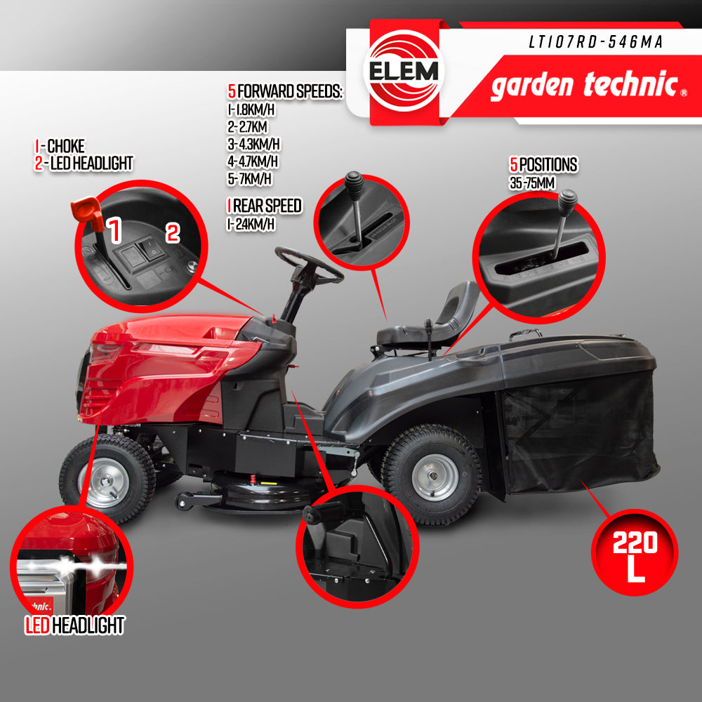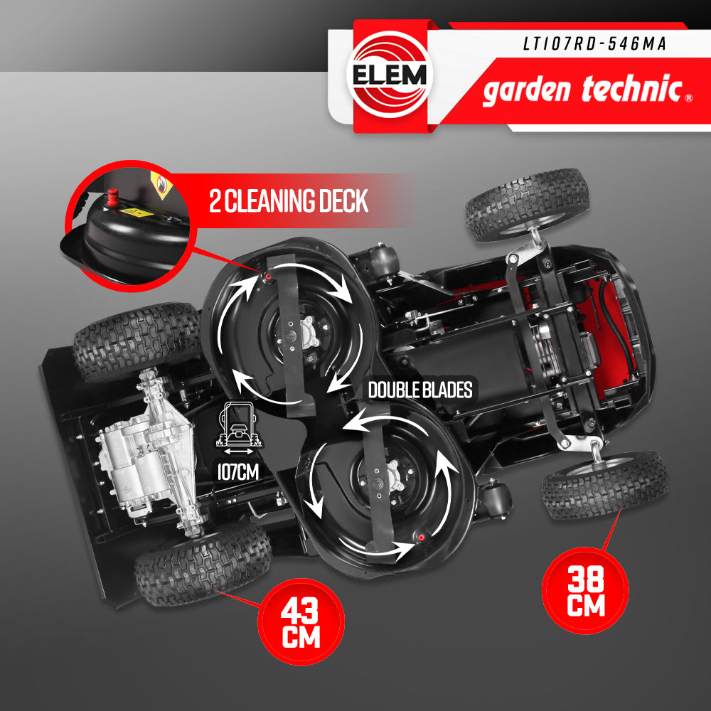 Entretenez votre terrain en toute simplicité avec le tracteur tondeuse thermique 546cc de Elem Garden Technic. Conçu pour les grandes surfaces jusqu’à 4000 m², il combine puissance, précision et confort pour des résultats impeccables.